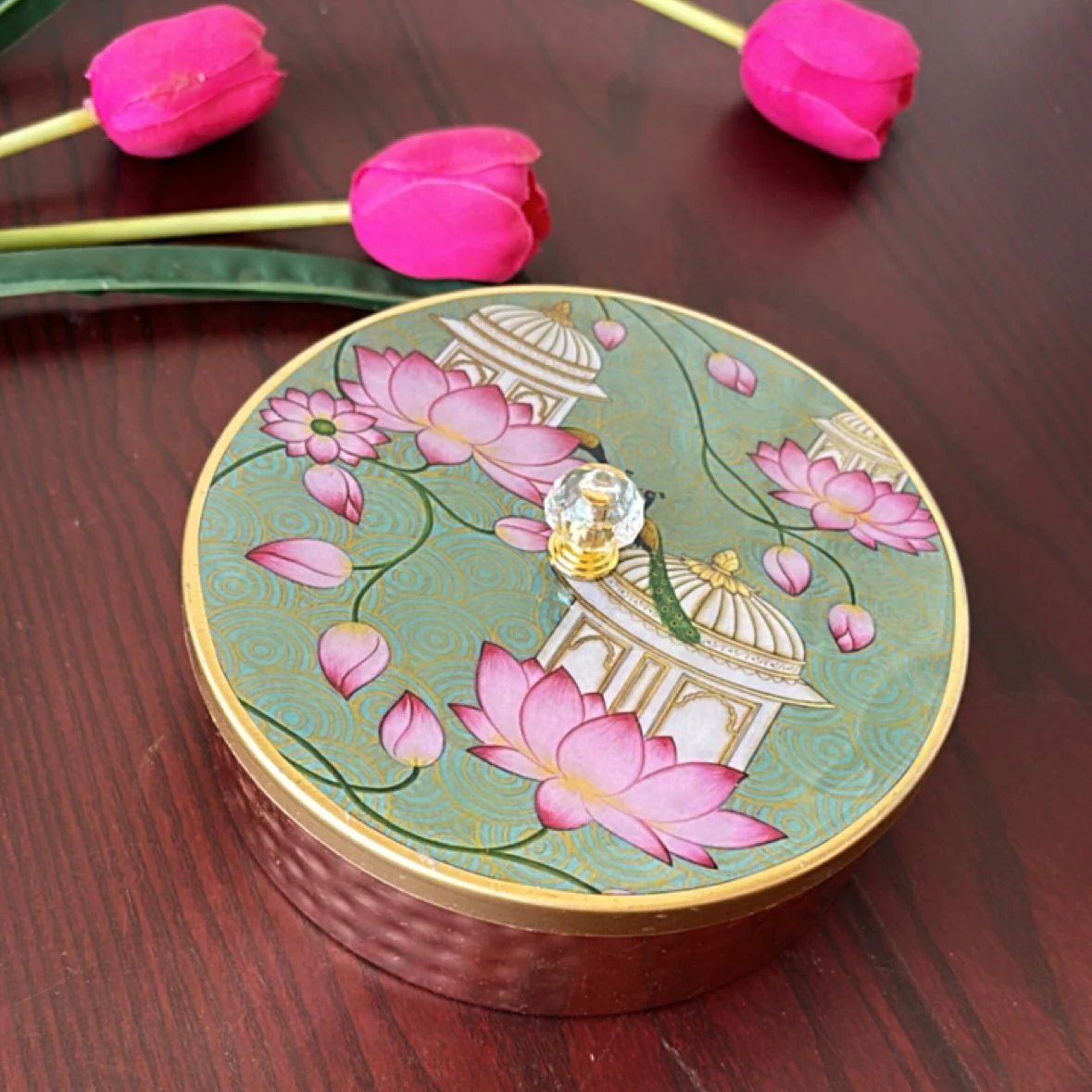 Elevate your home decor with this exquisite Lotus Elegance Decorative Storage Box. Featuring a beautifully hand-painted lid adorned with blooming lotus flowers, elegant domes, and a graceful peacock, this round box exudes traditional charm with a modern touch. The lid is topped with a crystal knob for easy handling, while the base boasts a hammered metallic gold finish for added luxury.